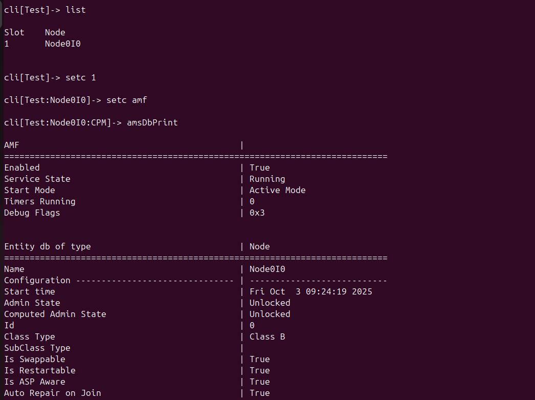 As illustrated in the figure, we begin by executing the “list” command to display the slots available in the global context. From there, the context is switched to Node0I0 using “setc 1”. Next, the command “setc amf” is issued to move into the AMF component context. Finally, by typing “amsDbPrint”, the console displays the complete set of AMS database information.